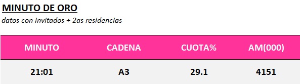 Inocentes consigue datos muy muy parecidos semana a semana al firmar ayer un 11.4% de cuota, 1.127.000 espectadores y 44.5% de fidelidad 10.8% de aportación a la audiencia de Antena 3, soportando un 18.3% de ocupación publicitaria.