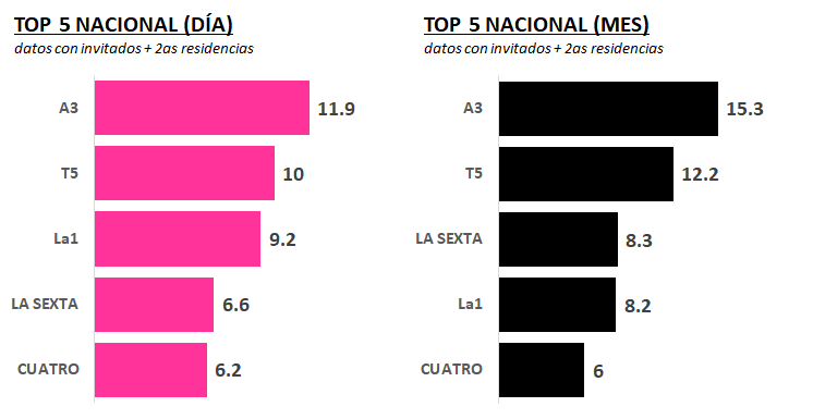 SOCIALITÉ mejora ayer en un +21.3% el dato de T5 en el día. 12.1% de share y 1 millón de espectadores. Muy buena fidelidad del 33.9% en hora y media de duración. Comercialmente sube hasta el 13.4%.