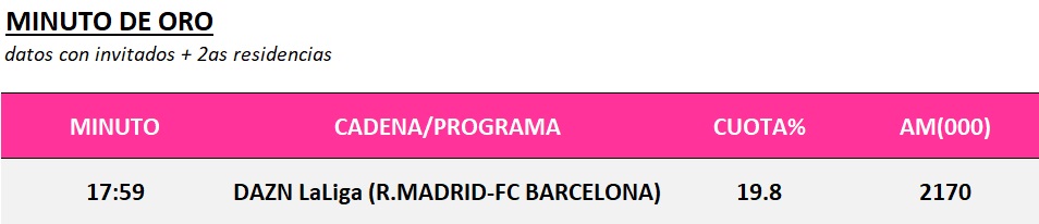 La victoria del REAL MADRID ante el FC BARCELONA en El Clásico arrasa en el pago con un 69.6% de cuota sobre los canales de este universo. Además, sobre total televisión es lo más visto del día con un 18.6% de cuota y 2.025.000 espectadores en DAZN La Liga.