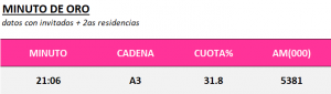 Mujer líder en su franja de emisión con 4.3 puntos de diferencia sobre la segunda cadena al promediar un 18.2% de cuota, 2.341.000 espectadores y ser sintonizada en algún momento por 4.165.000 personas. Aporta el 12.8% de toda la audiencia del día de Antena 3.