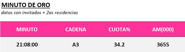 Enorme resultado para MI CASA ES LA TUYA dejando a la competencia por debajo de los dos dígitos en su franja de emisión con un 19.5% de cuota, 2.038.000 espectadores y 38.3% de fidelidad +3.7 puntos de subida.