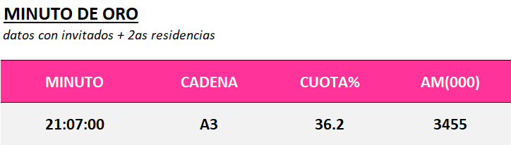 Pasapalabra destaca un día más registrando datos inalcanzables: 26.8% de share y 2.250.000 espectadores. 55.3% de fidelidad y registra el minuto de oro del día en su último minuto de programa a las 21:07 (36.2% y 3.455.000 espectadores).